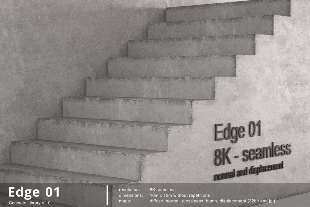"The volume contains 12 different Concrete Edges structures PBR Materials with 84 textures, that also can be used in all common engines."